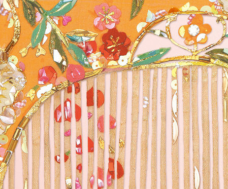 material : レース、ビーズ、スパンコール、ラインストーン、服飾パーツ、デットストックパフュームラベル、着物生地(全てアンティーク&ヴィンテージ)、色鉛筆 ...etc.