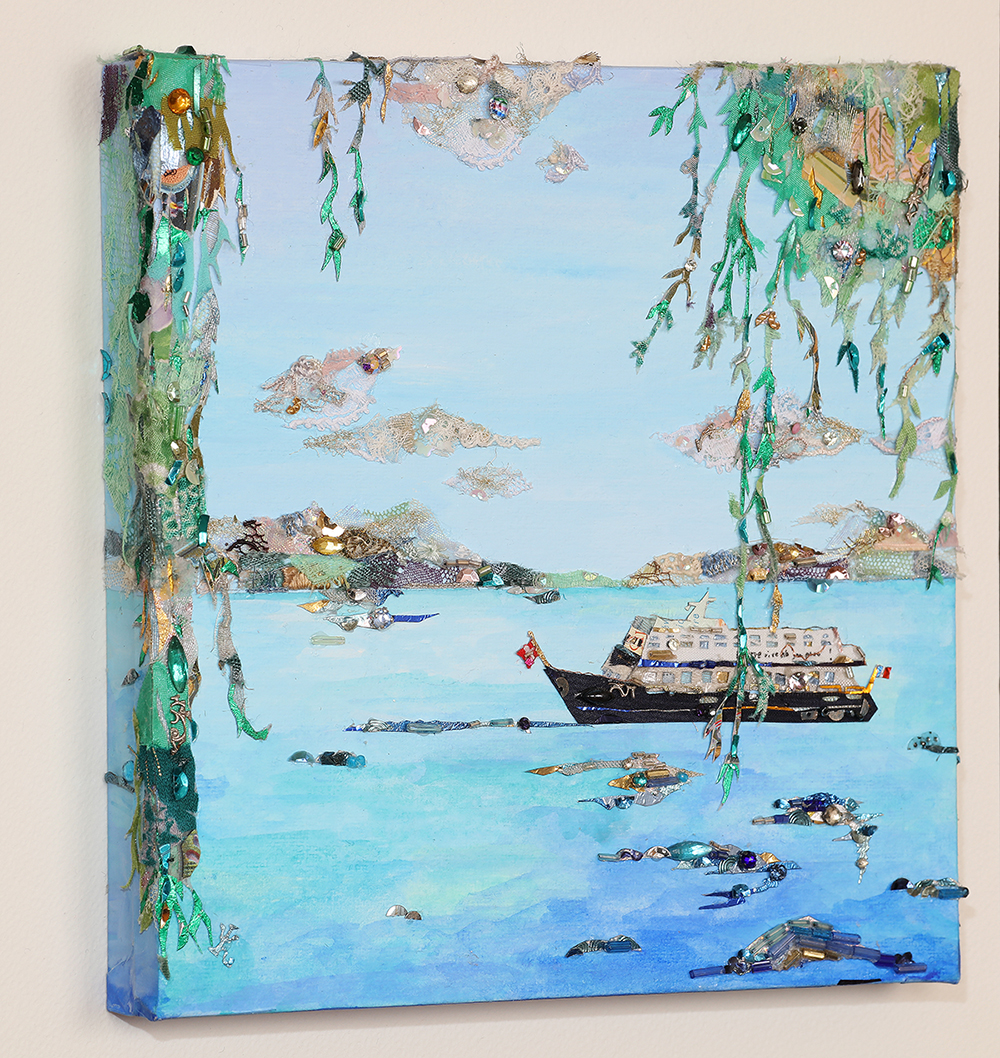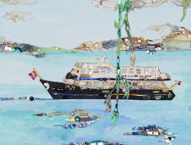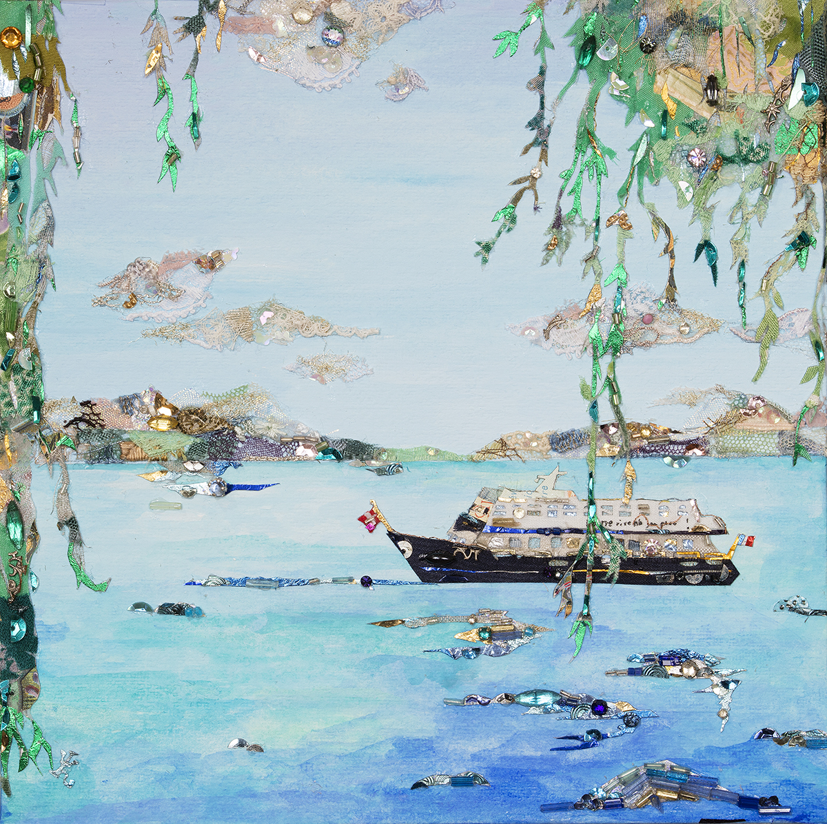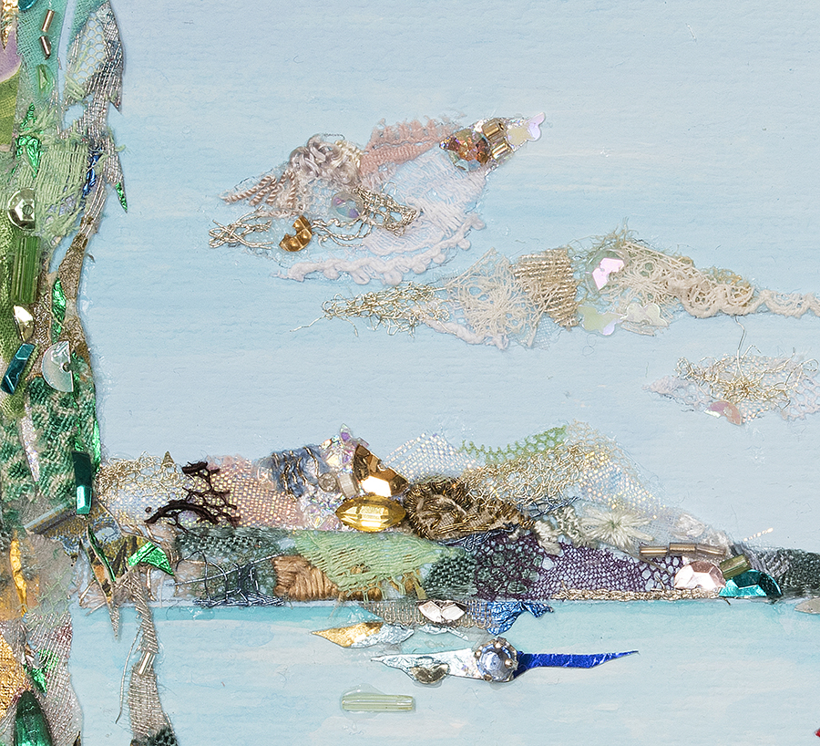 material : レース、ビーズ、スパンコール、服飾パーツ、着物生地、パフュームラベル(全てアンティーク&ヴィンテージ)、金箔、キャラメル包み紙、天然石、アクリルガッシュ(背景) ...etc.