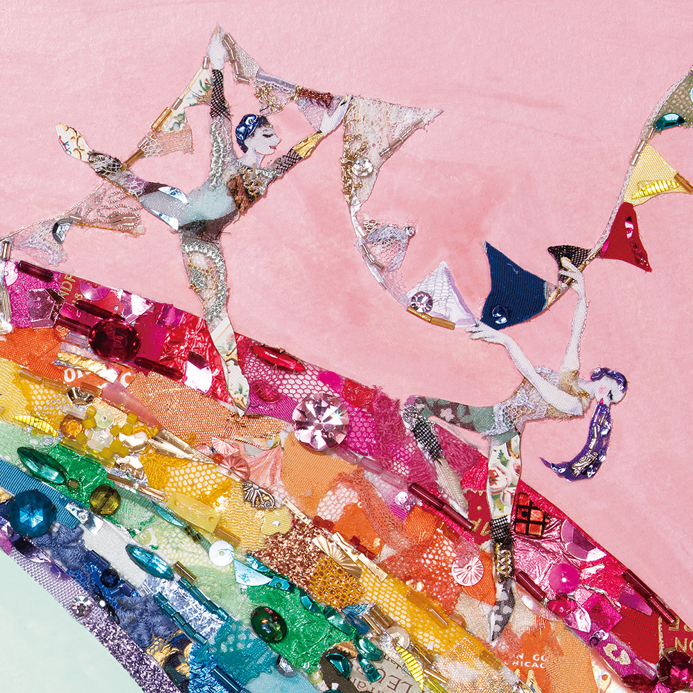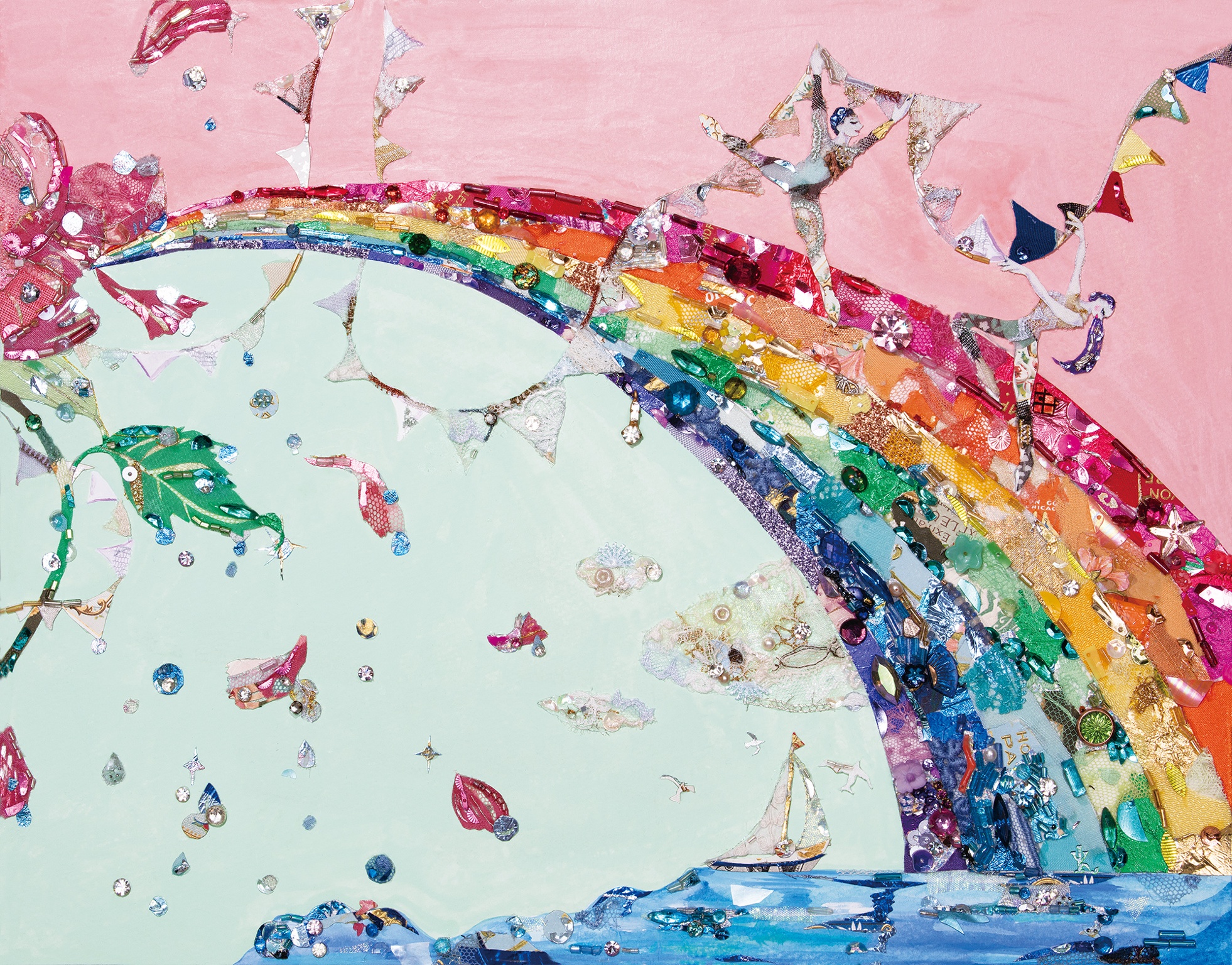 material : レース、ビーズ、スパンコール、服飾パーツ、着物生地、パフュームラベル(全てアンティーク&ヴィンテージ)、キャラメル包み紙、天然石、アクリルガッシュ(背景) ...etc.