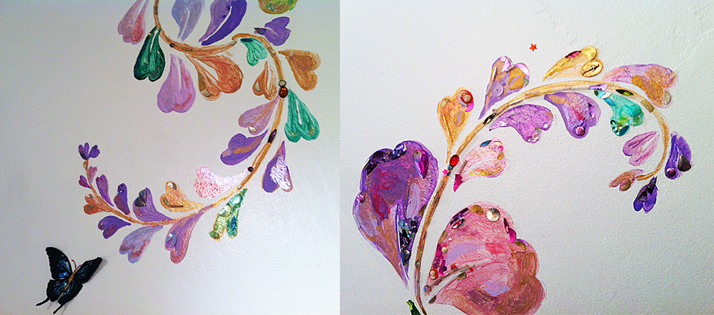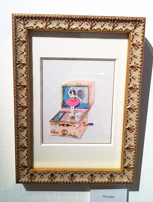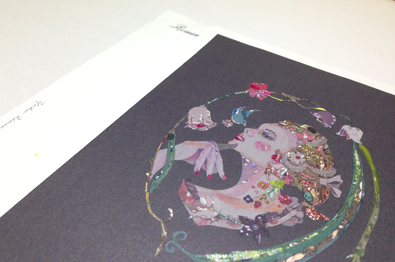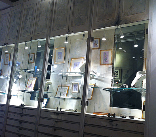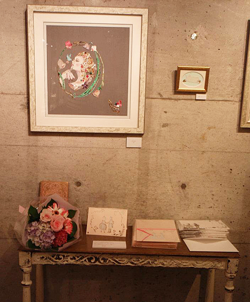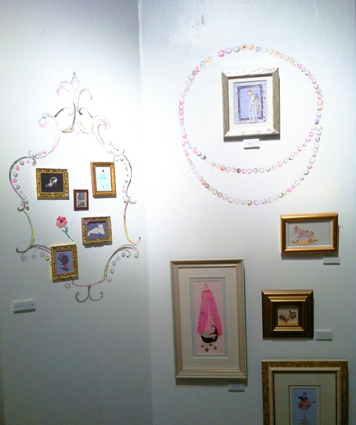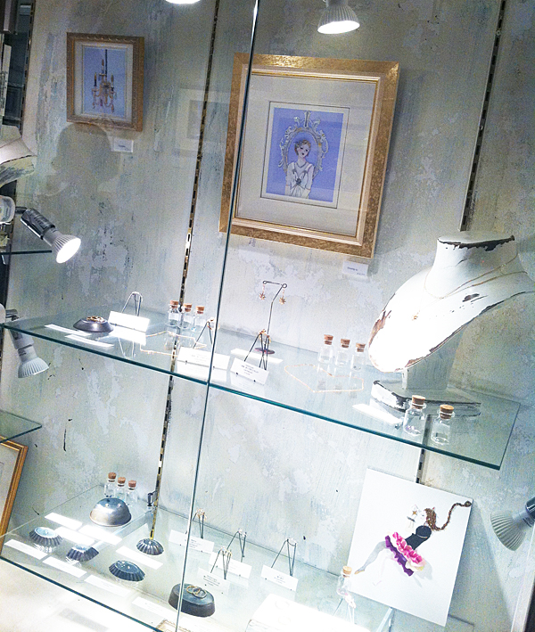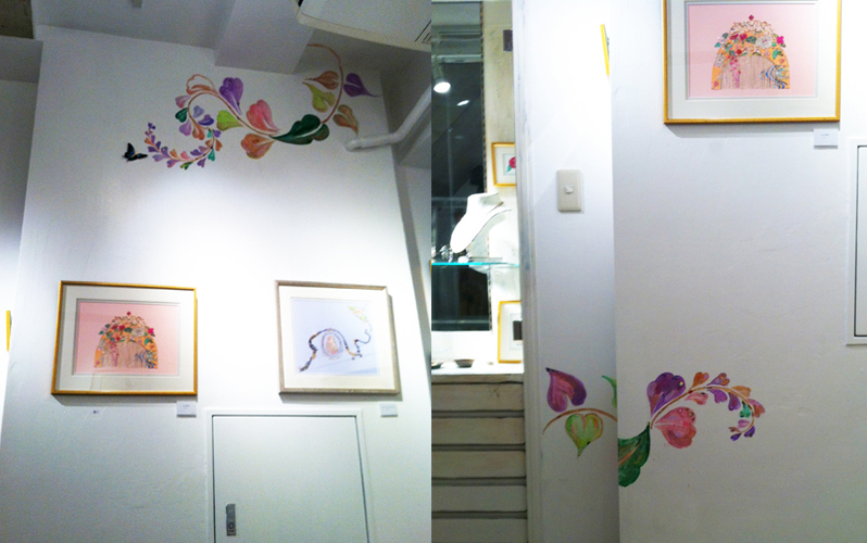 ジュエリーショップでの展示の為、ジュエリーの色やコンセプトに合わせ、大小40点あまりの額絵を展示、ディスプレイ致しました。また期間中には、アクリルガッシュとアンティーク素材で店内に壁画も描きました。